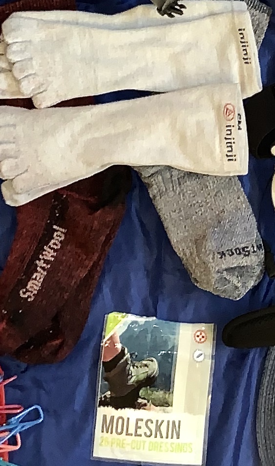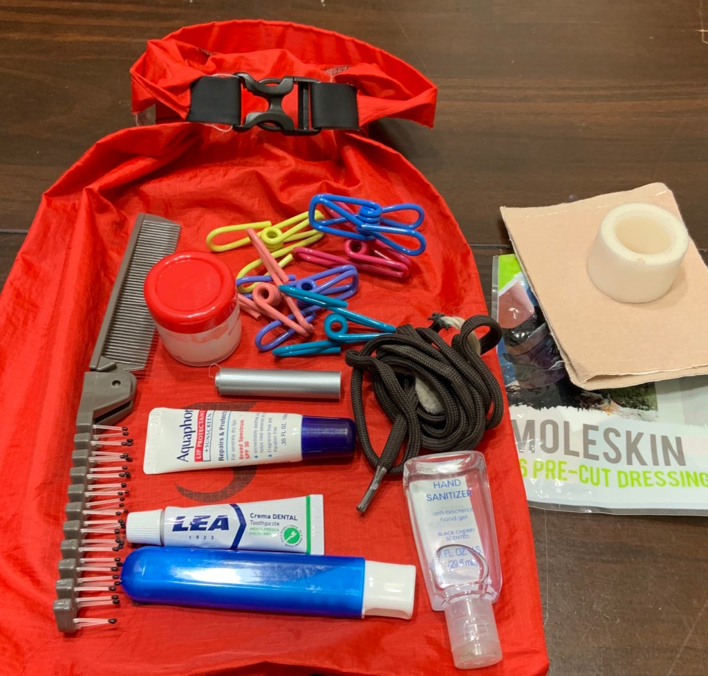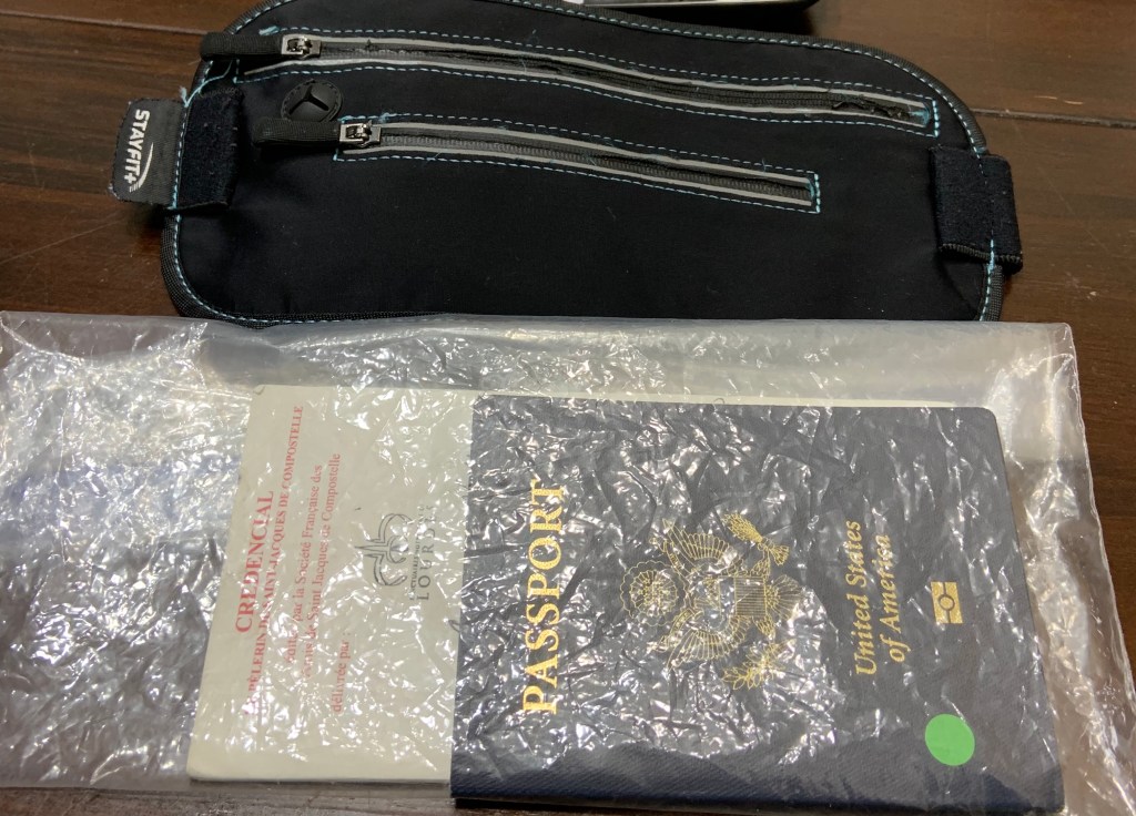 *small travel towel (Walmart) * undergarments 2 or 3 *Fleece pullover (Columbia brand)*dry bag(Walmart)*wire clothespins(Dollar Store)6*Headlamp(Cabela’s)*European plug adapter*backup charger*smartphone USB*toothbrush*toothpaste*pair of flip-flops*chapstick*swimsuit(optional)*hiking poles(REI)*camera(optional)*use dry-fit fabric for clothing; avoid cotton fabric. *1 dry-fit t-shirt*1 long sleeve dry-fit shirt with pockets*1 dry-fit long sleeve shirt*1 pair of shorts* 1 dry-fit pants*leggings*tank-top*rain jacket*rain pants. Finally, *mask*hand sanitizer.